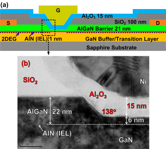 圖1 (a)研制的GaN增強型MIS-HEMT結構;(b)器件柵極TEM剖面圖