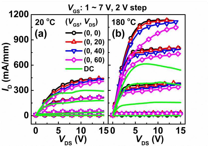 增強型,也叫常關型,是電力電子應用的關鍵要求,其中柵槽刻蝕工藝是最早實現GaN增強型器件的技術之一。傳統的刻蝕工藝主要在常溫下進行,無法實現刻蝕所造成的晶格損傷的原位恢復和刻蝕殘留物的及時清除,造成器件輸出電流的急劇降低,成為制約該技術在GaN功率電子領域的應用瓶頸。微電子所GaN功率電子器件研究團隊通過耐高溫刻蝕掩模技術,創新性地采用高溫柵槽刻蝕工藝顯著降低對溝道二維電子氣的損傷,提高了刻蝕殘留物的揮發。同時采用自主研制的臭氧輔助原子層沉積技術,制備出高絕緣、低缺陷的Al2O3柵介質,有效抑制了柵極漏電流。結合以上兩項創新(如圖1所示),最終研制出閾值電壓+1.6V,脈沖輸出電流高達1.13A/mm,關態功耗僅為6×10-8 W/mm的GaN增強型MIS-HEMT器件。相對于常溫刻蝕制備的MIS-HEMT器件(輸出電流0.42A/mm),高溫刻蝕輸出電流提高了將近兩倍(如圖2(a)和(b)所示)。
