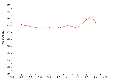 將該模塊放置在搭建成功的功率測試系統中,在4.35GHz下的功率輸出特性實測結果為:2*4層功率合成模塊的飽和輸出功率為46.82dBm( 48.08W),線性增益為9.5dB,PAE約為26%,合成效率達到75%。2*4層空間功率合成模塊不同頻率下(3.7GHz-4.4GHz),在下所對應的輸出功率,可以得到模塊在整個頻率范圍內(3.7GHz-4.4GHz)的輸出功率均大于20W(43dBm),下一步課題研究重點將集中在X波段的空間功率合成模塊的實現上。