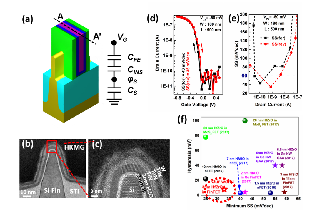 現(xiàn)有硅基晶體管受玻爾茲曼熱力學(xué)限制,室溫下亞閾值擺幅SS≥60mV/dec,阻礙了工作電壓的繼續(xù)降低。當(dāng)集成電路技術(shù)進(jìn)入5納米及以下節(jié)點(diǎn),隨著集成度的持續(xù)增加,在維持器件性能的同時(shí)面臨功耗急劇增加的嚴(yán)重挑戰(zhàn)。先導(dǎo)中心殷華湘研究員的團(tuán)隊(duì)在主流后HKMG FinFET集成工藝的基礎(chǔ)上,通過材料工藝優(yōu)化和多柵器件電容匹配設(shè)計(jì),結(jié)合高質(zhì)量低界面態(tài)的3納米鉿鋯金屬氧化物薄膜,研制成功性能優(yōu)異的NC-FinFET器件,實(shí)現(xiàn)了SS和閾值電壓回滯分別為34.5mV/dec和9mV的500納米柵長(zhǎng)NC-FinFET器件,以及SS和閾值電壓回滯分別為53mV/dec和40mV的20納米柵長(zhǎng)NC-FinFET器件。其中,500納米柵長(zhǎng)NC-FinFET器件的驅(qū)動(dòng)電流比常規(guī)HfO2基FinFET器件(非NC-FinFET)提升了260%且電流開關(guān)比(Ion/Ioff)大于1x106,標(biāo)志著微電子所在新型NC-FinFET器件的研制方面取得了重要進(jìn)展。