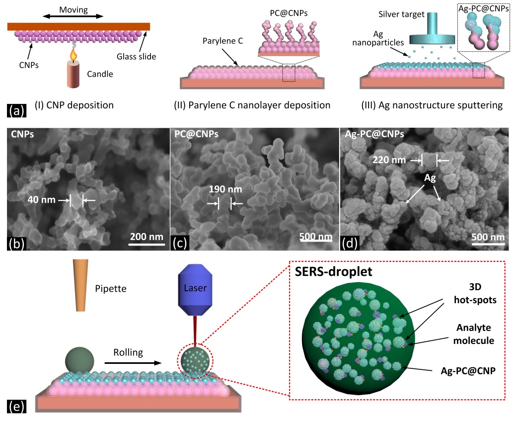 陳大鵬研究員課題組提出了一種開放式SERS液滴傳感器,該傳感器打破了傳統(tǒng)基底型SERS器件所需的復(fù)雜制備工藝問題,利用燭灰納米鏈結(jié)構(gòu)的多孔易斷性,以滾動(dòng)的方式在基底上在形成了具有豐富三維“熱點(diǎn)”的SERS活性液滴,從而大大增強(qiáng)該液滴的拉曼檢測(cè)性能。液滴所提供的液相環(huán)境能夠保持生物分子的活性,并提高生物大分子(如蛋白質(zhì)、DNA)等與“熱點(diǎn)”的有效結(jié)合。因此,該SERS液滴傳感器的設(shè)計(jì)開發(fā)為液體活檢分析等技術(shù)提供了新的檢測(cè)理念。