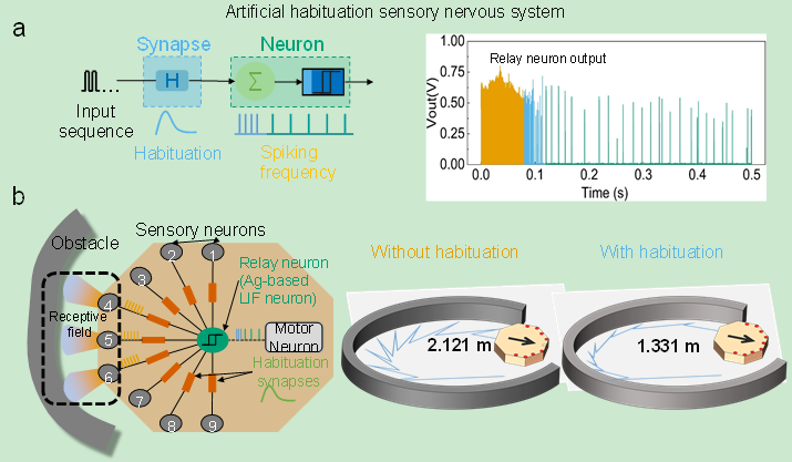 研究團隊基于Mott憶阻器和傳感器構建了感受神經(jīng)元,該神經(jīng)元能夠感知外界的模擬信號并轉化成實時的動態(tài)脈沖信號,實現(xiàn)了對外界信號進行感知并傳輸?shù)幕竟δ堋8惺苌窠?jīng)元進一步通過突觸器件與中繼神經(jīng)元相連接構建了習慣化感知系統(tǒng)。該突觸器件具有連續(xù)刺激下權值的習慣化演進趨勢,進而影響感受神經(jīng)元信號向中繼神經(jīng)元傳輸?shù)男剩怪欣^神經(jīng)元的輸出呈現(xiàn)頻率下降特性(即習慣化特性,如圖a所示)。基于這一習慣化特性,團隊進一步構建習慣化脈沖神經(jīng)網(wǎng)絡用于實現(xiàn)機器人避障功能。測試結果顯示,基于習慣化的學習規(guī)則所構建的所示憶阻器基人工感受神經(jīng)系統(tǒng)能夠有效提升機器人的避障效率(如圖b)。該習慣化感受神經(jīng)系統(tǒng)還可通過不同的傳感器應用于不同的感知系統(tǒng),如嗅覺、味覺、視覺、聽覺等。通過實現(xiàn)生物現(xiàn)實的感知系統(tǒng),有望實現(xiàn)更具生物智能的終端系統(tǒng)。