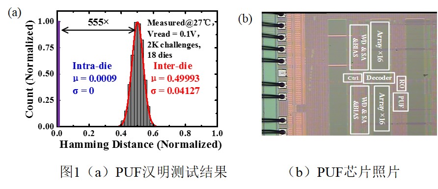 基于阻變存儲(chǔ)器隨機(jī)短期記憶時(shí)間,劉明院士團(tuán)隊(duì)與之江實(shí)驗(yàn)室、復(fù)旦大學(xué)的研究人員合作,從隨機(jī)源的物理模型出發(fā),設(shè)計(jì)了互補(bǔ)結(jié)構(gòu)阻變單元陣列熵源、片上測(cè)量電路、軟編程電路、記憶時(shí)間計(jì)數(shù)器和比特流截取電路等關(guān)鍵電路模塊,實(shí)現(xiàn)了完整的PUF IP的設(shè)計(jì)和驗(yàn)證。芯片測(cè)試結(jié)果顯示,PUF的平均片內(nèi)漢明距離為0.49993,平均片間漢明距離為0.0009,均接近理想值。經(jīng)過(guò)對(duì)PUF產(chǎn)生的100M比特流進(jìn)行了NIST的測(cè)試,該芯片通過(guò)了全部NIST測(cè)試項(xiàng)。