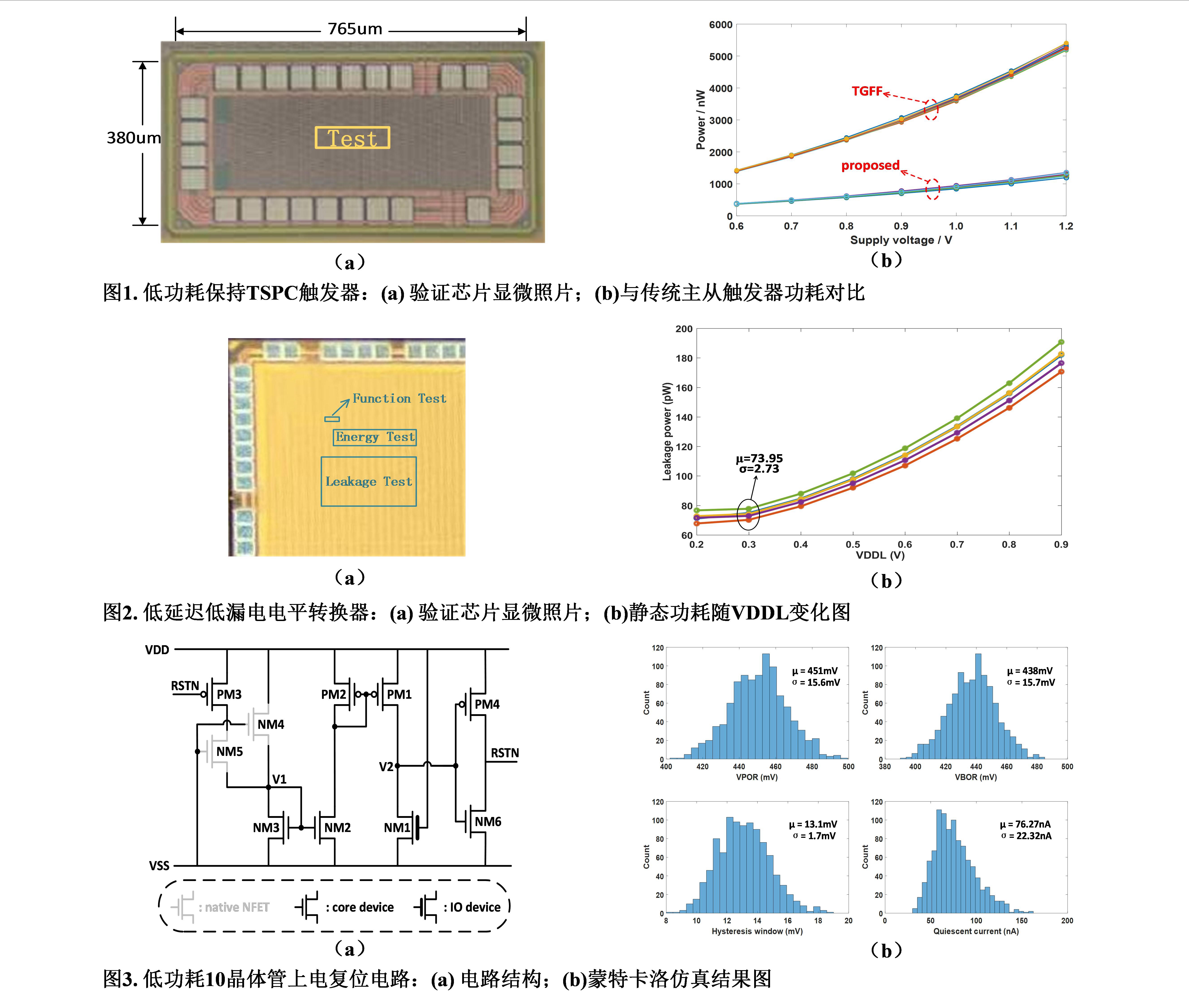 本研究首次提出了領(lǐng)先的零冗余動(dòng)態(tài)功耗觸發(fā)器、pW級(jí)寬范圍電平轉(zhuǎn)換器、以及nW級(jí)高精度上電復(fù)位電路,可廣泛應(yīng)用于低功耗的智能計(jì)算芯片。針對(duì)傳統(tǒng)主從觸發(fā)器由于冗余操作造成的功耗浪費(fèi)問(wèn)題,提出了一種兼容近/亞閾值設(shè)計(jì)的低功耗保持 TSPC觸發(fā)器。該觸發(fā)器采用輸入感知預(yù)充策略,輔以浮動(dòng)節(jié)點(diǎn)分析和晶體管級(jí)優(yōu)化,有效降低了觸發(fā)器的功耗。流片結(jié)果表明,該觸發(fā)器功耗相比于傳統(tǒng)主從觸發(fā)器降低了73%。針對(duì)傳統(tǒng)電平轉(zhuǎn)換器轉(zhuǎn)換范圍窄、漏電大、不適用于近/亞閾值設(shè)計(jì)的問(wèn)題,提出了一種低延遲低漏電電平轉(zhuǎn)換器。該電平轉(zhuǎn)換器基于電流鏡結(jié)構(gòu),采用混合閾值電流鏡技術(shù)有效解決了切斷直流通路后的節(jié)點(diǎn)壓降問(wèn)題,同時(shí)采用超截?cái)嗉夹g(shù)進(jìn)一步優(yōu)化了電平轉(zhuǎn)換器的漏電。流片結(jié)果表明,該電平轉(zhuǎn)換器支持0.12V-1.2V的電壓轉(zhuǎn)換,漏電低至73.95pW。在數(shù)字系統(tǒng)中,系統(tǒng)上電和掉電時(shí)還需要一個(gè)復(fù)位信號(hào)將系統(tǒng)中的存儲(chǔ)單元設(shè)置為一個(gè)確定的狀態(tài)。為了保證近/亞閾值下數(shù)字系統(tǒng)的穩(wěn)定工作,需要觸發(fā)閾值低、閾值偏差小、靜態(tài)電流小的上電復(fù)位電路。針對(duì)以上問(wèn)題,本研究提出了一種低功耗10晶體管上電復(fù)位電路。該上電復(fù)位電路基于電流參考和電流比較器結(jié)構(gòu),僅用 10個(gè)晶體管即實(shí)現(xiàn)了高精度低功耗的上電復(fù)位電路。仿真結(jié)果表明,該上電復(fù)位電路在不同工藝角和溫度條件下,觸發(fā)電壓偏差僅為34mV,在0.5V的電源電壓下靜態(tài)功耗低至36nW。