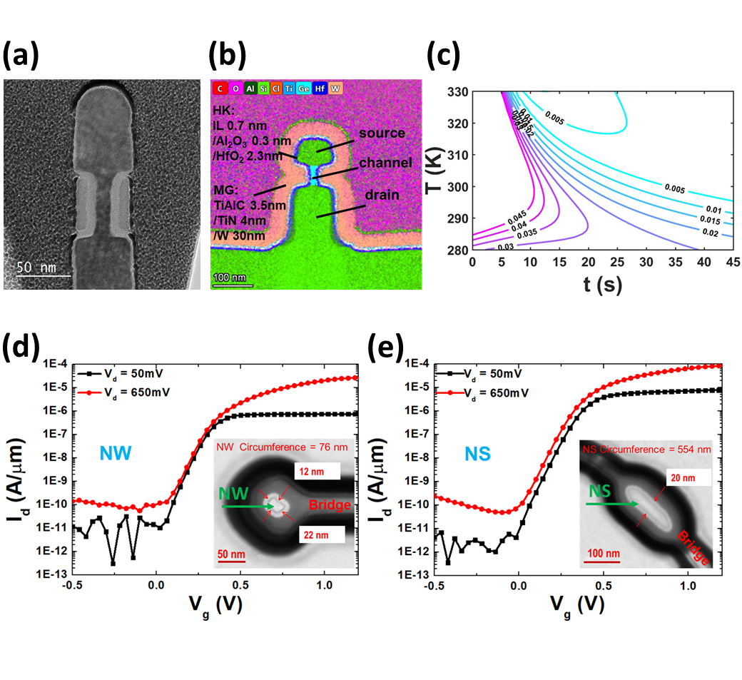 圖 (a) 替代柵結構TEM截面,(b) 垂直環(huán)柵納米器件TEM截面的EDX元素分布圖,(c)氧化-刻蝕模型,(d) n型垂直環(huán)柵納米線器件的Id-Vg特性及TEM俯視插圖,(e) n型垂直環(huán)柵納米片器件的Id-Vg特性與TEM俯視插圖