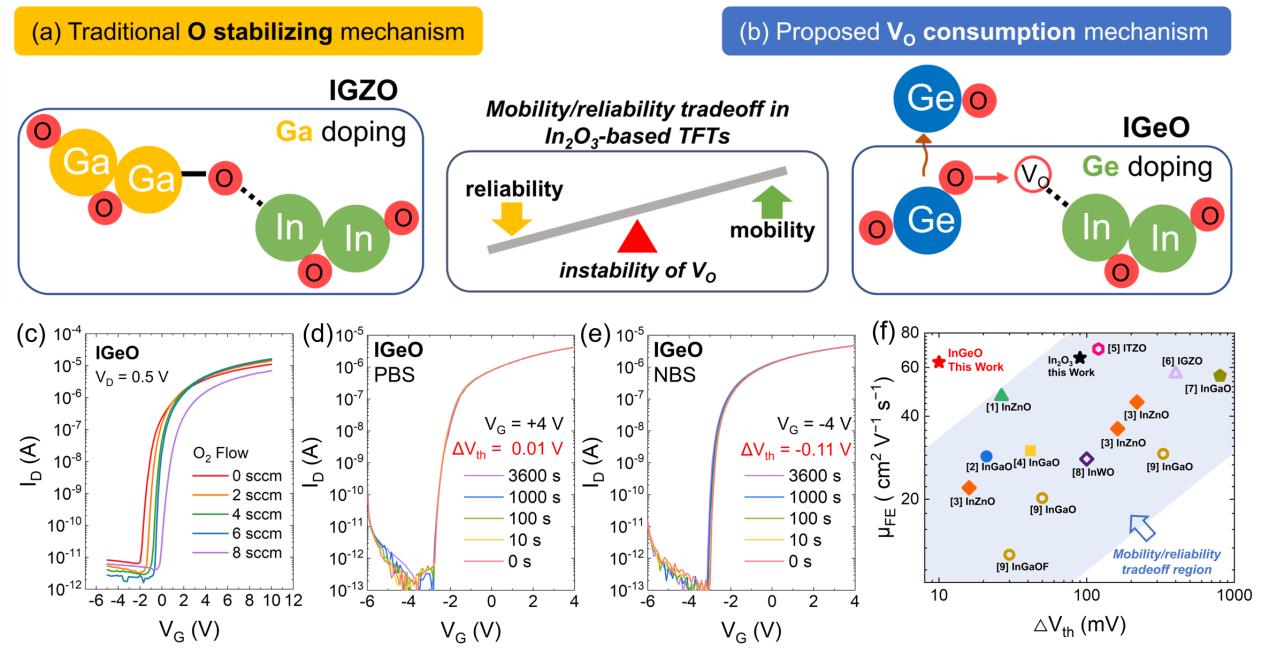 ????該研究成果以題為“Ge-doped In2O3: First Demonstration of Utilizing Ge as Oxygen Vacancy Consumer to Break the Mobility/Reliability Tradeoff for High Performance Oxide TFTs”入選2024年VLSI會(huì)議,并做口頭報(bào)告。微電子所王嘉義助理研究員、白子恒助理研究員為共同第一作者,王盛凱研究員、李泠研究員為通訊作者。