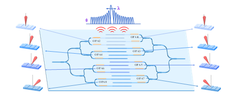 FMCW激光測(cè)量技術(shù)作為一種具有測(cè)距測(cè)速一體、探測(cè)精度高、抗干擾能力強(qiáng)的新型激光測(cè)量技術(shù),團(tuán)隊(duì)從調(diào)頻、發(fā)射、掃描、探測(cè)和處理等角度凝練主要關(guān)鍵技術(shù),梳理片上集成FMCW激光雷達(dá)在相關(guān)領(lǐng)域的應(yīng)用前景和典型系統(tǒng)示例,展望片上集成FMCW激光雷達(dá)面臨的潛在挑戰(zhàn)及發(fā)展趨勢(shì)。團(tuán)隊(duì)博士研究生袁野聚焦關(guān)鍵技術(shù)解決方案,開(kāi)展一系列研究工作,首先針對(duì)光學(xué)相控陣(Optical Phased Array,OPA)遠(yuǎn)場(chǎng)光斑發(fā)散、發(fā)射損耗較大、掃描視場(chǎng)受限等問(wèn)題,提出一種新型的氮化硅-硅雙層叉指波導(dǎo)光柵天線陣列。針對(duì)非均勻OPA峰值旁瓣水平隨著掃描角度的增大而減小的問(wèn)題,提出一種基于混沌序列的雙重自適應(yīng)度遺傳算法優(yōu)化天線陣列。相關(guān)工作發(fā)表在“Applied Optics:Novel interdigital waveguide grating antenna array for optical phased array”、“Optics and Lasers in Engineering:Non-uniform optical phased array based on dual-adaption genetic algorithm improved by chaos sequence”等期刊中,微電子所袁野博士為第一作者,朱精果研究員為通信作者。