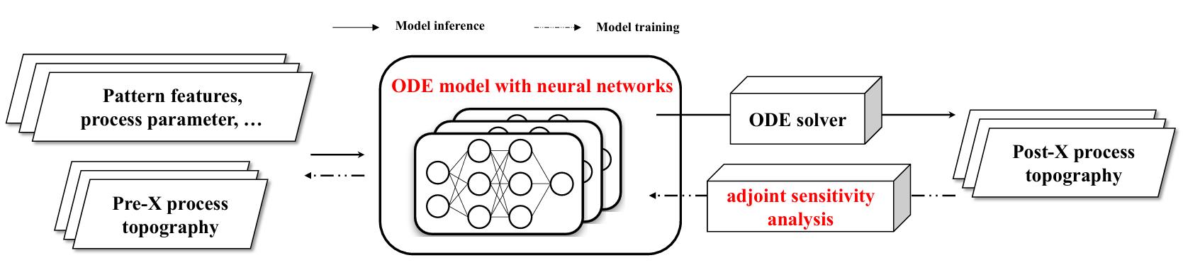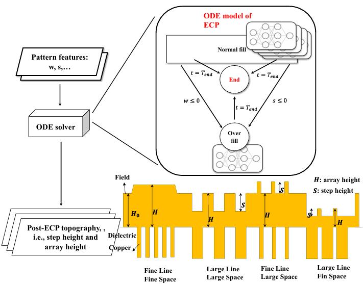 為了解決上述問題,陳嵐研究員團隊提出了一種基于神經常微分方程的通用工藝建模方法。該方法把神經網絡整合進描述單元工藝形貌演化的常微分方程中,有效平衡了數(shù)據驅動模型和半物理模型兩種主流建模方法的優(yōu)缺點,顯著降低了建模過程對專家知識的依賴。該方法在28/32/40 nm實際工藝的后道化學機械平坦化(CMP)、銅電鍍(ECP)工藝中得到驗證,其準確性優(yōu)于現(xiàn)有半物理模型,與數(shù)據驅動模型表現(xiàn)相當。