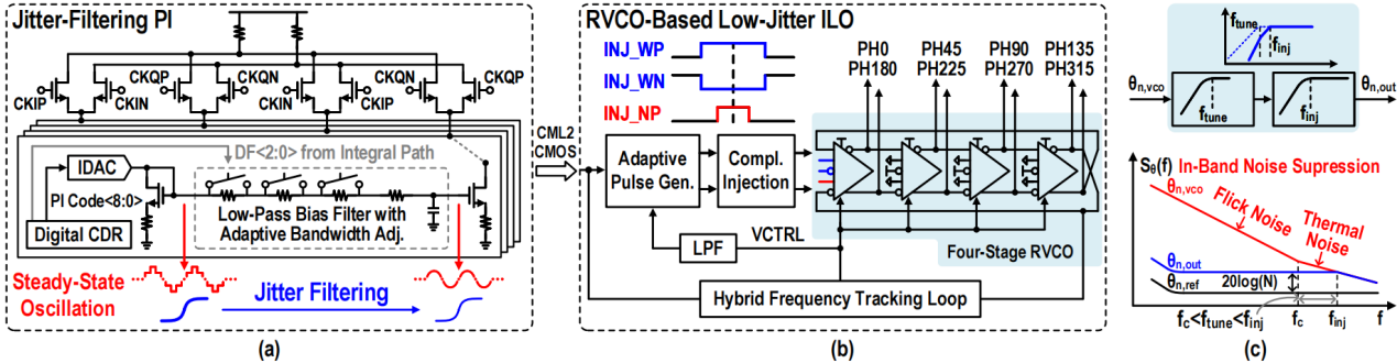 圖2. 基于PI-ILO的多相時鐘產(chǎn)生(a)抖動濾除相位插值器;(b)基于環(huán)形VCO的注入鎖定振蕩器;