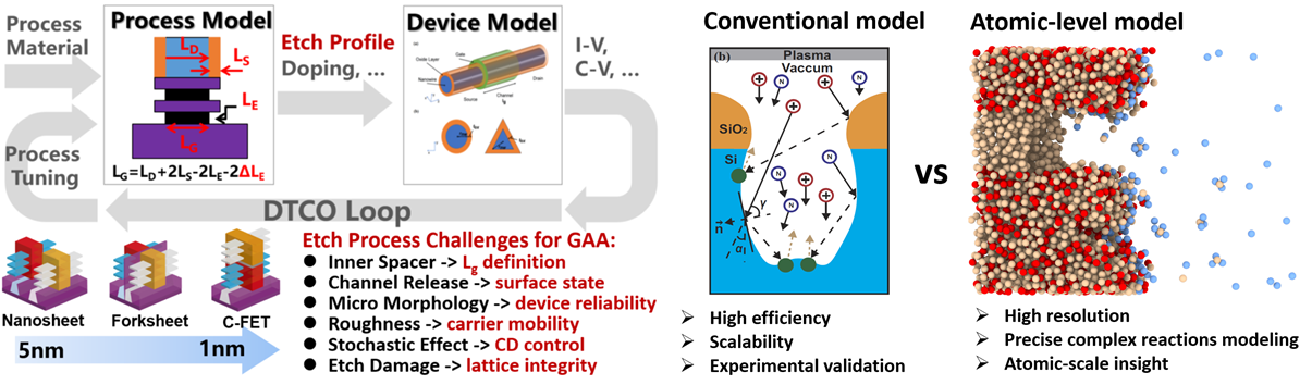 在2nm以下技術(shù)節(jié)點三維集成電路晶體管制造中,內(nèi)側(cè)墻、溝道釋放、介質(zhì)隔離等關(guān)鍵環(huán)節(jié)亟需突破高精度刻蝕工藝,以實現(xiàn)尺寸微縮和器件效能提升。當(dāng)特征尺寸進入納米尺度時,刻蝕反應(yīng)截面呈現(xiàn)顯著的尺寸效應(yīng),反應(yīng)截面和缺陷等微觀物理現(xiàn)象難以通過傳統(tǒng)表征手段獲取,現(xiàn)有刻蝕模型雖能預(yù)測宏觀形貌演變,但在納米尺度存在根本性局限。如何結(jié)合前沿人工智能技術(shù),實現(xiàn)從原子級精度模擬刻蝕動力學(xué)過程,理解其微觀結(jié)構(gòu)演變過程,進而預(yù)測并優(yōu)化宏觀工藝參數(shù)以實現(xiàn)目標(biāo)器件性能,是人工智能賦能集成電路先進制造的關(guān)鍵科學(xué)問題。