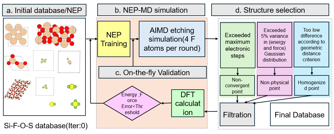 圖2:機器學(xué)習(xí)勢函數(shù)的構(gòu)建與迭代優(yōu)化工作流程。