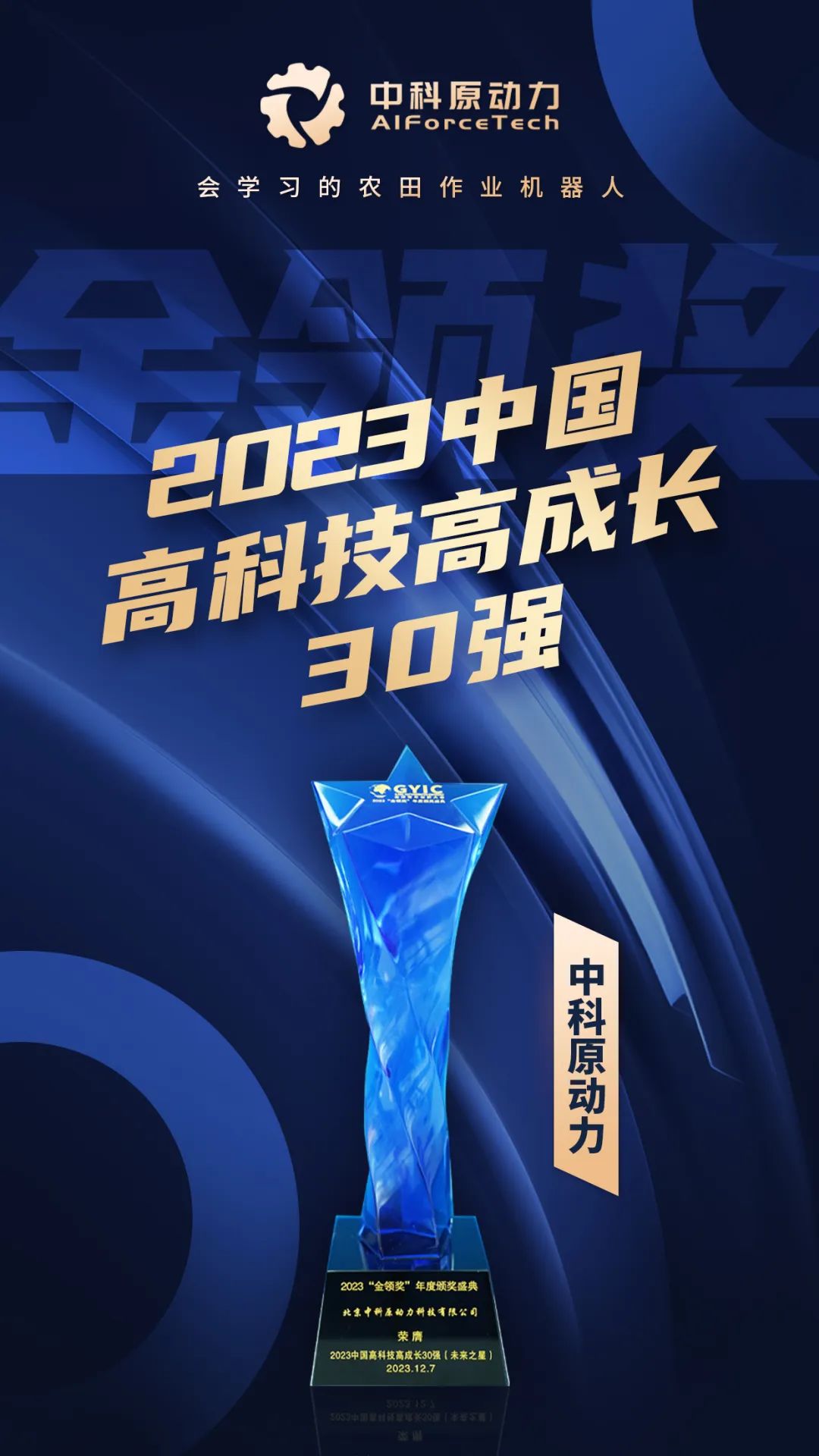12月7日,2023(第七屆)全球青年創(chuàng)新大會(GYIC)暨“金領(lǐng)獎”年度頒獎盛典在北京成功舉辦,中科原動力榮膺“2023 中國高科技高成長30 強(qiáng)”;中科原動力CEO 韓威博士獲得“2023 年度杰出青年創(chuàng)新領(lǐng)袖”榮譽(yù)稱號。