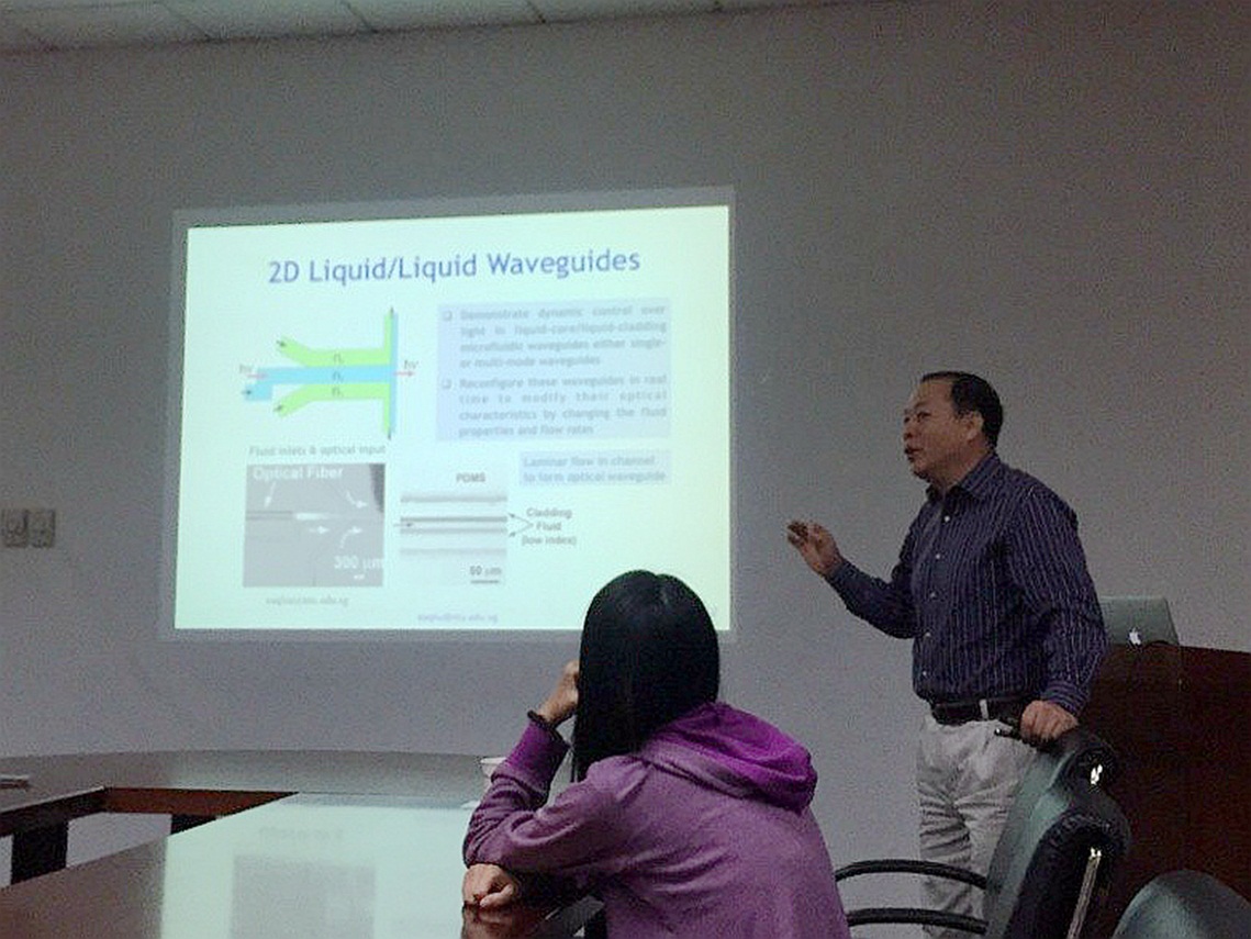 劉愛(ài)群作了題為“What’s Matter of Optofluidics(光流控技術(shù))”的學(xué)術(shù)報(bào)告,詳細(xì)介紹了其課題組近年來(lái)在光流控領(lǐng)域的研究工作,特別是自光壓(力)、光流控波導(dǎo)技術(shù)以及利用光流控波導(dǎo)實(shí)現(xiàn)光波的彎曲和對(duì)光的操控等方面的研究成果。與會(huì)人員就光壓的產(chǎn)生、微納米顆粒的操控、光流控波導(dǎo)的應(yīng)用等技術(shù)問(wèn)題與劉愛(ài)群進(jìn)行了交流。交流會(huì)結(jié)束后,劉愛(ài)群參觀了微電子所凈化工藝線,與科研人員就硅基光子學(xué)的相關(guān)研究及合作進(jìn)行了深入探討。