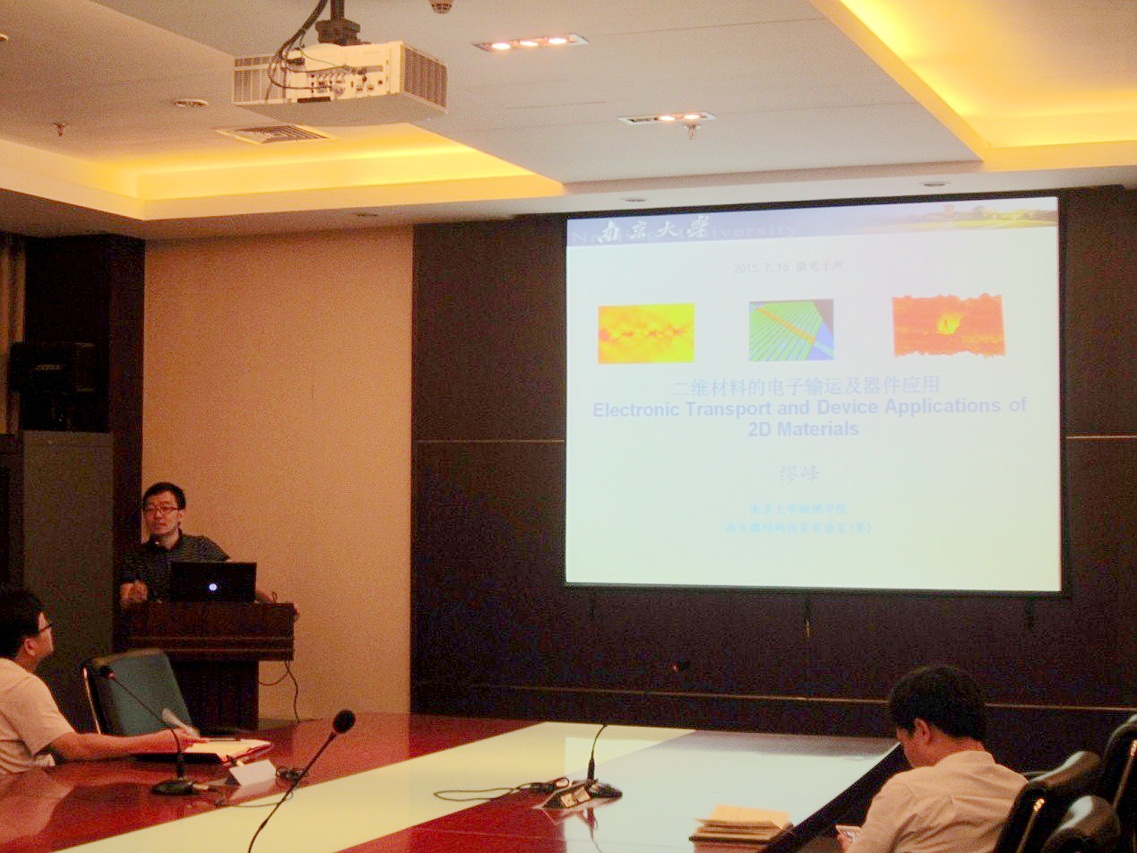 7月16日,南京大學物理學院繆峰教授應邀來微電子所訪問交流,并作了題為《二維材料的電子輸運和器件應用》的學術報告。微電子所科研人員、研究生共40余人參加了交流會。交流會由微電子所三室主任劉明研究員主持。