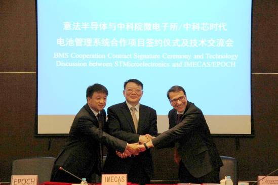 5月15日,微電子所與意法半導體、中科芯時代科技有限公司在京舉行項目合作簽約儀式。意法半導體集團全球執行副總裁Marco Maria Monti、意法半導體汽車電子與分立半導體事業部總經理Fabio Marchio、意法半導體大中華暨南亞區高級總監莫爾立、北京市經信委電子信息產業處副處長王德、微電子所所長葉甜春、中科芯時代科技有限公司董事長侯曉瑞及相關部門負責人參加了簽約儀式。葉甜春、Marco Maria Monti、侯曉瑞代表三方就聯合開發應用于新能源汽車的電池管理系統芯片簽署項目合作協議。