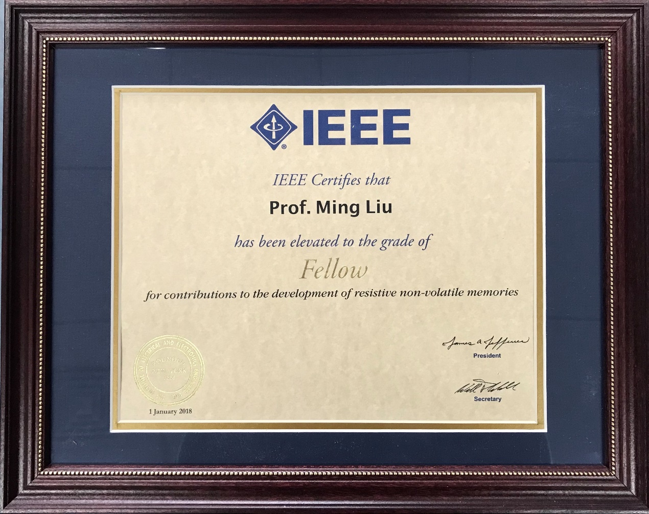 IEEE Fellow是IEEE授予會(huì)員的最高榮譽(yù),被學(xué)術(shù)界認(rèn)定為權(quán)威的榮譽(yù)和重要的職業(yè)成就,其評(píng)選過程非常嚴(yán)謹(jǐn),每年由同行專家在做出突出貢獻(xiàn)的會(huì)員中評(píng)選出,每次獲選人數(shù)不超過會(huì)員總數(shù)的0.1%,在世界學(xué)術(shù)界及工程技術(shù)界競(jìng)爭(zhēng)非常激烈。劉明的成功當(dāng)選表明其在阻變存儲(chǔ)器研究方面取得的成績(jī)得到了國際學(xué)術(shù)界的認(rèn)可。