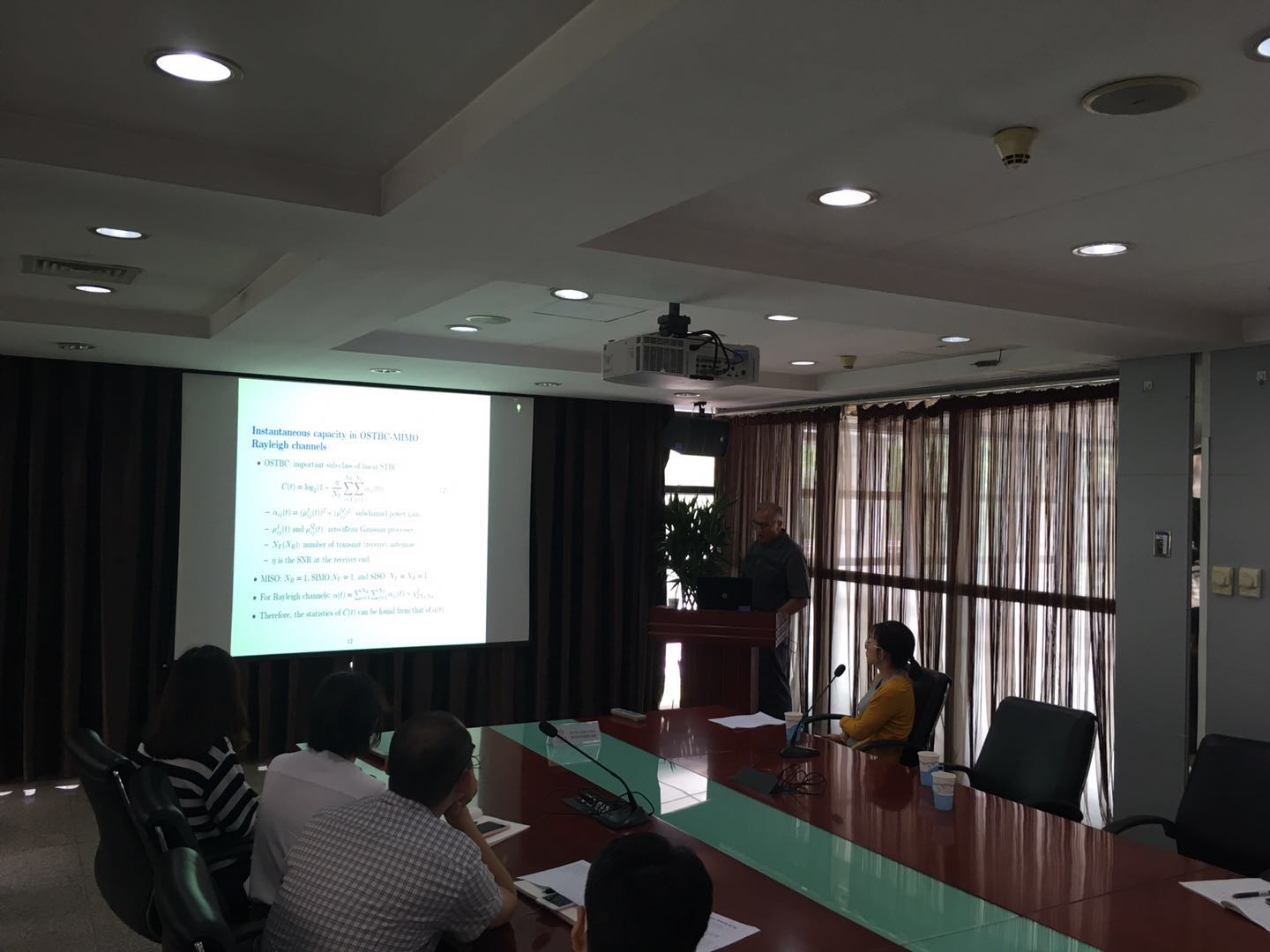 Neji YOUSSEF圍繞多天線無線通信系統在衰落信道下的性能分析這一主題作報告。他首先介紹了無線通信系統在衰落信道下的衰落間隔分析的意義和難點,講解了自己提出的一種分析多天線無線通信系統在瑞利衰落信道下的衰落間隔的、基于正交空時分組碼的近似模型,分享了該模型的部分測試結果和仿真驗證。與會人員就感興趣的話題同YOUSSEF教授進行了深入討論,會場氣氛活躍。