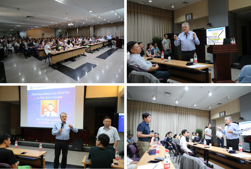 Klaus von Klitzing教授分享了獲得諾貝爾物理學(xué)獎的成果。在進行霍爾效應(yīng)實驗時,他觀測到霍爾電阻不按線性關(guān)系變化,而隨著磁場強度的增大而做階梯式變化。進過分析計算,得到其霍爾電阻值為h/(e2f ),h為普朗克常量,e為基本電荷,f為填充因子。這樣在器件上測量量子化霍爾電阻是當(dāng)今最穩(wěn)定最易于復(fù)現(xiàn)的電阻器,與器件參數(shù)無關(guān),量子霍爾電阻成為了電阻定義的標(biāo)準(zhǔn)。此后的瓦特天平借由量子霍爾效應(yīng)與約瑟夫森效應(yīng)精確測得的電阻與電勢,使標(biāo)準(zhǔn)的質(zhì)量、長度、時間等基本物理量間建立聯(lián)系,借助這一方法,就能以非常高的精度測量普朗克常數(shù)的值。在這基礎(chǔ)上,實現(xiàn)了以普朗克常數(shù)重新定義的“千克”單位。與會人員就相關(guān)問題同Klaus von Klitzing 教授進行了深入交流。