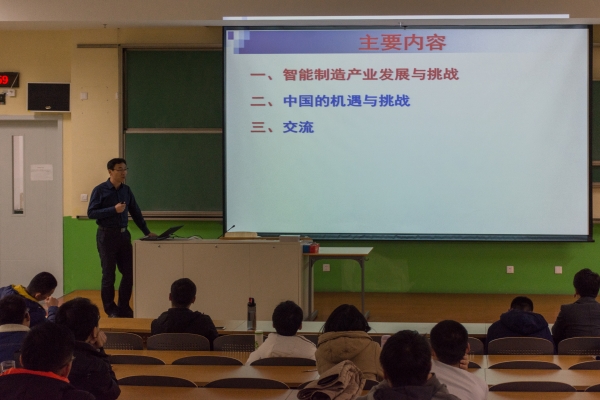 最后,老師講到在新形勢和挑戰(zhàn)下,我國智能制造產(chǎn)業(yè)正在走著一條“工業(yè)2.0補(bǔ)課-工業(yè)3.0普及-工業(yè)4.0示范”的發(fā)展之路。同時,王老師熱情地回答了同學(xué)們有關(guān)制造的自動化、制造的智能化與制造自動化的提高對傳統(tǒng)工業(yè)的影響等疑問。講座結(jié)束之際,王老師鼓勵同學(xué)們要有“為天下”的責(zé)任意識,要有“為國家圖富強(qiáng)”的使命擔(dān)當(dāng)。在近兩小時的專題講座中,同學(xué)們對于智能制造技術(shù)的概念和產(chǎn)業(yè)發(fā)展有了新的認(rèn)識,紛紛表示在今后的學(xué)習(xí)科研中,將學(xué)術(shù)實踐相結(jié)合,努力為實現(xiàn)“智造強(qiáng)國”夢添磚加瓦。