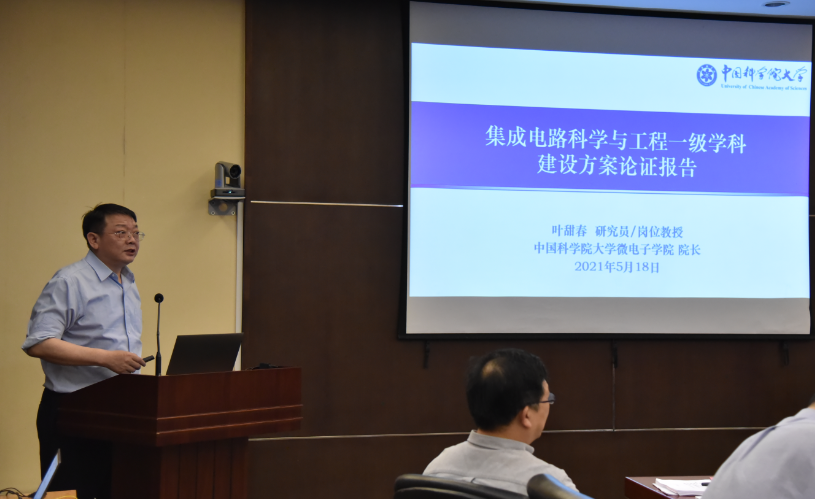 論證會(huì)專家組由浙江大學(xué)吳漢明院士擔(dān)任組長,成員包括:西安電子科技大學(xué)郝躍院士、復(fù)旦大學(xué)劉明院士、清華大學(xué)吳華強(qiáng)教授、北京大學(xué)蔡一茂教授、東南大學(xué)黃慶安教授、南京大學(xué)施毅教授、華中科技大學(xué)繆向水教授、北京理工大學(xué)王業(yè)亮教授、中科院半導(dǎo)體所譚平恒研究員,以及中科院微電子所葉甜春研究員、王文武研究員、周玉梅研究員、曹立強(qiáng)研究員、夏洋研究員、陳嵐研究員。中國科學(xué)院大學(xué)微電子學(xué)院副院長焦建彬教授、電子電氣與通信工程學(xué)院副院長孫應(yīng)飛教授、培養(yǎng)與學(xué)位部副部長王濟(jì)州、培養(yǎng)與學(xué)位部專業(yè)學(xué)位辦公室主任趙永利,以及中科院空天信息創(chuàng)新研究院教育處處長盧蔥蔥、微電子所科教融合中心副主任(主持工作)崔京參加論證會(huì)。