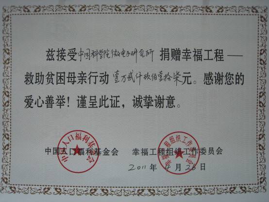 今年是開展“幸福工程——救助貧困母親行動”的第十五年。根據國家計生委和國家幸福工程組委會的有關文件精神和統一部署,微電子所于近期組織了“向實行計劃生育的貧困母親獻愛心”捐款活動,以實際行動表達對貧困母親的關愛和支持。