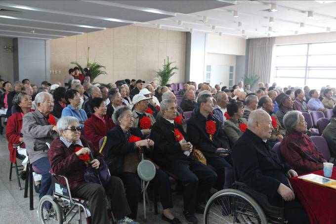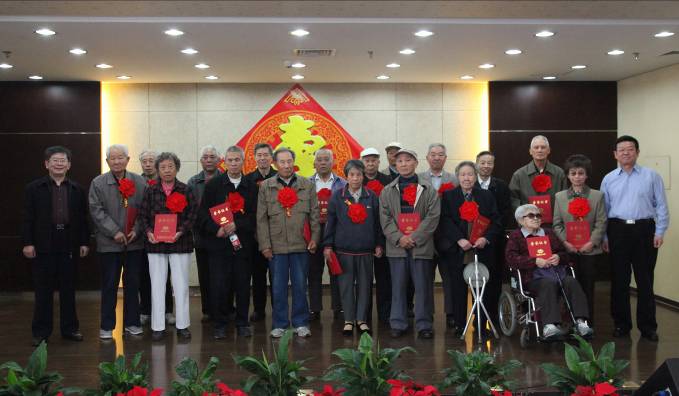 主席臺上鮮花擁簇,背景墻上一米見方的巨大“壽”字赫然奪目。一大早,離退辦工作人員就到位迎接從四面八方而至的老人們。所長葉甜春、黨委書記李培金、副所長陳大鵬、院離退休干部局副局長李杰以及所人教處、所辦、黨辦同志向所有的參加活動的老人們熱情祝壽。