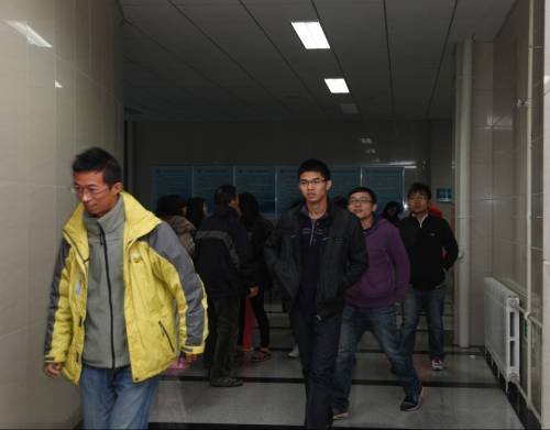 為了使疏散演練接近真實,此次演習是在不事先通知學生的情況下進行,早7點20分,人教處研究生部三位老師和兩位宿舍管理員準時到位,分別在7、8、9層各個安全通道處就位準備疏散引導學生。7點30分演習正式開始,各樓道投擲模擬著火煙霧彈后煙霧報警器開始報警,同學們很多還在睡夢中,聽到報警器和中控室發出的火災疏散指令之后陸續離開房間,從安全通道跑下樓,有的同學用毛巾捂住口鼻跑出宿舍,5分鐘后學生基本全部離開房間,8分鐘后所有學生到達在研究生宿舍樓前空曠處。