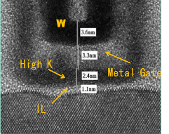 圖1 22納米 柵長NMOS截面和高K/金屬柵堆疊結構的TEM照片(中科院微電子研究所,2012)