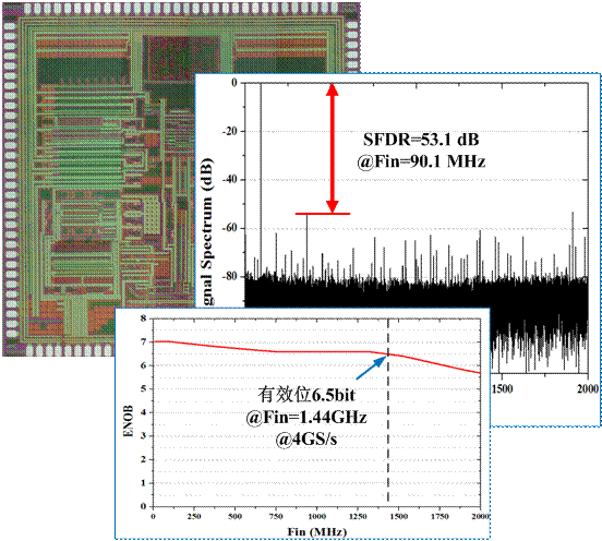 研制成功的芯片包括:4GS/s 8bit ADC,該芯片由兩路ADC交織而成,每路集成寬帶采樣保持電路并采用優化的折疊內插結構實現。芯片內部集成SPI編程接口,可以有效校準兩路ADC之間的失調并且靈活配置ADC的工作模式。該芯片采用國產工藝流片實現,測試有效位大于7.0 bit,模擬輸入帶寬達1.5GHz。該芯片為目前國內最高采樣率的8bit ADC芯片。