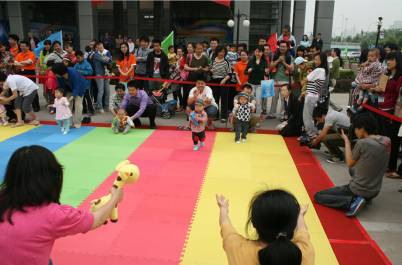 才藝展示分為趣味競爬競走,舞臺表演和作品展示三個部分,包含幼兒競爬、幼兒競走、歌唱、舞蹈、武術、樂器演奏、繪畫、書法、手工制作等多個項目。活動以幼兒競爬競走拉開序幕。20多名2歲以下的寶寶分為三組。比賽開始了,寶寶們表現各異,有的“勇往直前”,有的則瞪著圓溜溜的大眼睛好奇地望著四周,有的依偎在媽媽懷中不肯放手,有的干脆躺在軟墊上“閉目養神”……家長們也使出渾身解數,有的揮舞奶瓶和玩具,有的拍手召喚,有的干脆跟寶寶一起加入活動……場地上空響起陣陣歡快的笑聲。