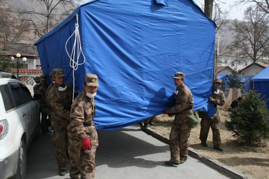 解放軍戰(zhàn)士幫助救災隊抬來機站用帳篷