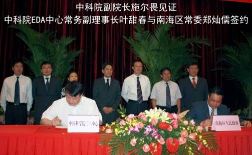 5月14日,為加快推動(dòng)南海集成電路設(shè)計(jì)、微電子及家電產(chǎn)業(yè)的發(fā)展,中科院EDA中心常務(wù)副理事長(zhǎng)葉甜春與佛山市南海區(qū)委常委鄭燦儒在佛山市楓丹白鷺正式簽訂了共建中科院EDA中心南海分中心協(xié)議。中科院副院長(zhǎng)施爾畏,廣東省科技廳副廳長(zhǎng)陳新,佛山市委書記、市長(zhǎng)陳云賢出席了簽約儀式。