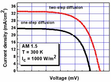 圖2 光照下超小絨面電池一次擴散和兩次擴散的I-V特性曲線比較