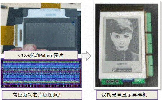 射頻集成電路研究室在該項目上的863伙伴“蘇州漢朗光電”的EPD技術起源于劍橋大學,在EPD材料領域經過了多年的積累,具有大尺寸和真彩支持等優點。本次產品開發是基于超高壓CMOS工藝(90V)的多電壓Driver設計并一次流片成功。產品在超高壓CMOS工藝上使用了正、負對稱高壓輸出設計。相比于同類單側高壓設計,便于簡化顯示器驅動電源設計,并在EPD領域首次實現超高壓COG(Chip-On-Glass)封裝驅動。