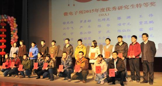 在表彰環(huán)節(jié),陳大鵬宣讀了2015年先進(jìn)集體、個(gè)人的表彰名單。葉甜春、李培金、周玉梅、周也方、劉新宇分別為微電子所2015年度科研成果獎(jiǎng)、先進(jìn)工作者和優(yōu)秀研究生特等獎(jiǎng)獲獎(jiǎng)?wù)哳C獎(jiǎng)。