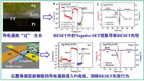 劉明課題組在陽離子基阻變存儲(chǔ)器的微觀機(jī)制、性能調(diào)控和集成技術(shù)上開展了系統(tǒng)的研究工作。在前期工作的基礎(chǔ)上,課題組最近發(fā)現(xiàn)在陽離子基阻變存儲(chǔ)器中存在置位(SET)和復(fù)位(RESET)過程的競(jìng)爭,造成了該類器件復(fù)位操作的失效。通過TEM和EDS的測(cè)試分析,發(fā)現(xiàn)構(gòu)成導(dǎo)電細(xì)絲的活性金屬在電場(chǎng)作用下會(huì)擴(kuò)散進(jìn)入到Pt電極中,從而在Pt電極中形成額外的活性金屬源,造成復(fù)位操作的失效。課題組提出了在Pt電極表面增加離子阻擋層來抑制導(dǎo)電細(xì)絲過生長進(jìn)入Pt電極的解決方案,發(fā)展了插入單層石墨烯作為離子阻擋層的新結(jié)構(gòu)器件,TEM結(jié)果表明石墨烯插層能夠有效阻擋導(dǎo)電細(xì)絲過生長進(jìn)入Pt電極層,電學(xué)實(shí)驗(yàn)結(jié)果證明石墨烯插層器件消除了復(fù)位操作失效的現(xiàn)象,在改善器件的可靠性的同時(shí)仍具有優(yōu)良的阻變存儲(chǔ)性能。