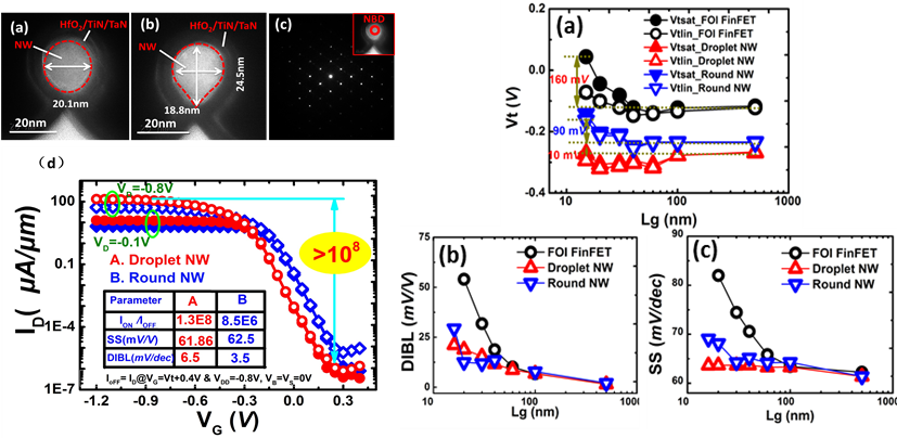 針對上述納米線晶體管架構在集成電路發(fā)展應用中所面臨的難題,殷華湘研究員研發(fā)團隊提出在主流硅基FinFET集成工藝基礎上,通過高級刻蝕技術形成體硅絕緣硅Fin和高k金屬柵取代柵工藝中選擇腐蝕SiO2相結合,最終形成全隔離硅基環(huán)柵納米線MOS器件的新方法。并在取代柵中絕緣硅Fin釋放之后,采用氧化和氫氣退火兩種工藝分別將隔離的“多邊形硅Fin”轉化成 “倒水滴形”和“圓形”兩種納米線結構。由于在該方法中,納米線溝道由單晶硅襯底制作形成,導電溝道中材料晶格缺陷更少、界面質量更高。兩種高k金屬環(huán)柵納米線晶體管都表現(xiàn)出很好的器件特性,其中通過氧化制備的“倒水滴形”環(huán)柵納米線晶體管在16nm物理柵長(對應5nm及以下技術代)下,獲得器件亞閾值特性SS = 61.86 mV/dec 和DIBL = 6.5 mV/V,電流開關比大于1E8。SS和DIBL十分接近MOSFET的理論極限數(shù)值(60mV/dec和0 mV/V),遠超以往同類工藝制造的FinFET性能參數(shù),也達到目前同類器件所報道的最高水平。同時,該類器件結構也可以通過同樣的方法在多步刻蝕和取代柵工藝中制作成多層堆疊納米線,該項研究工作正在進行中。這種不同于現(xiàn)有國際報道的制造方法具有完全自主知識產(chǎn)權,可為未來我國集成電路下一代關鍵技術的創(chuàng)新發(fā)展提供核心器件架構和制造工藝開發(fā)的多樣選擇。該工作以《通過一種先進工藝形成具有優(yōu)異短溝道控制能力的新型p型環(huán)柵納米線場效應晶體管》為題發(fā)表在國際微電子器件領域頂級期刊《IEEE電子器件快報》上(IEEE Electron Device Letters,DOI: 10.1109/LED.2018.2807389),并被選為該期期刊首篇論文。