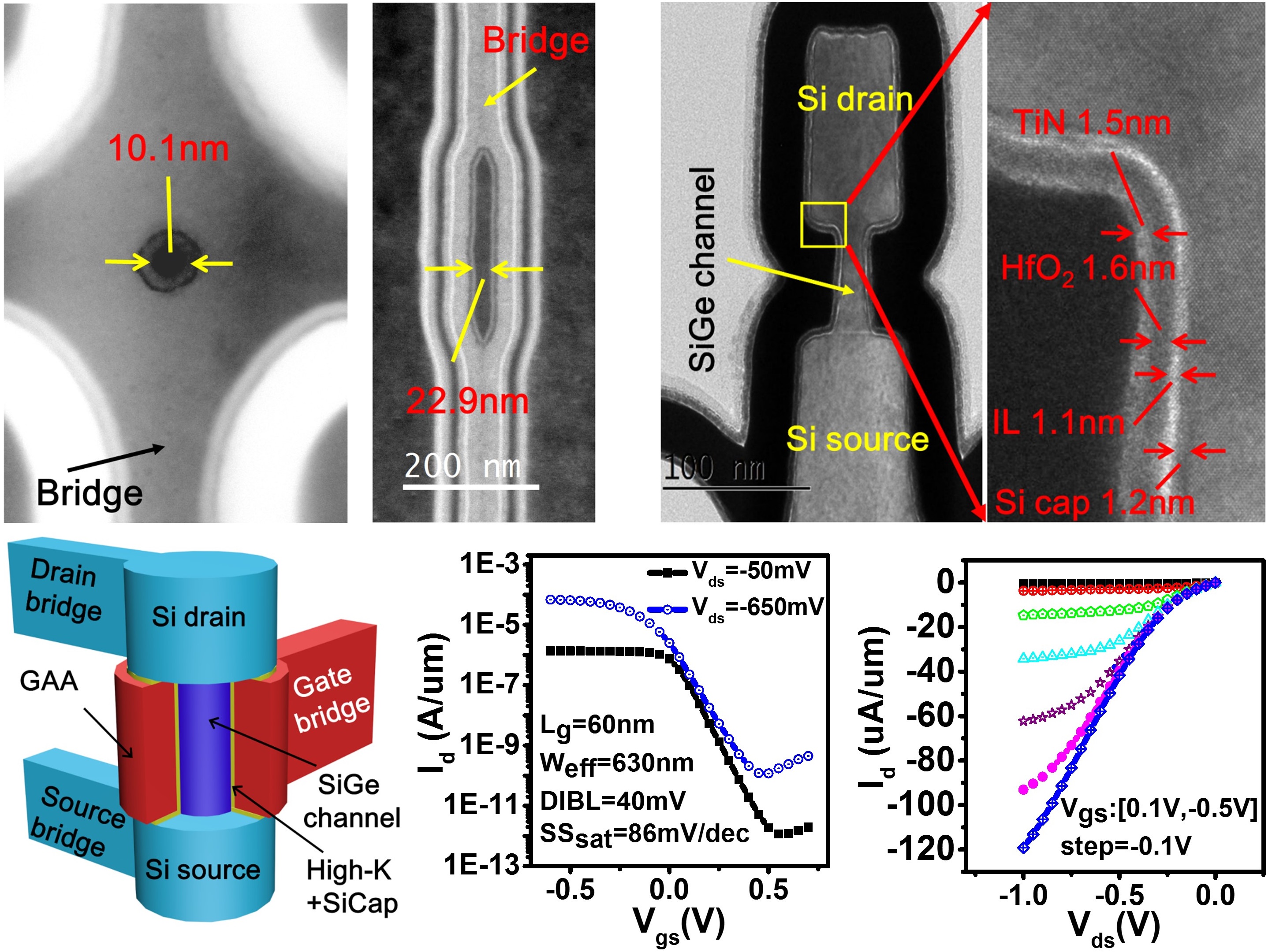 朱慧瓏課題組系統(tǒng)地研發(fā)了一種原子層選擇性刻蝕鍺硅的方法,結(jié)合多層外延生長技術(shù)將此方法用于鍺硅/硅超晶格疊層的選擇性刻蝕,從而精確地控制納米晶體管溝道尺寸和有效柵長;首次研發(fā)出了垂直納米環(huán)柵晶體管的自對準高k金屬柵后柵工藝;其集成工藝與主流先進CMOS制程兼容。課題組最終制造出了柵長60納米,納米片厚度20納米的p型VSAFET。原型器件的SS、DIBL和電流開關(guān)比(Ion/Ioff)分別為86mV/dec、40mV和1.8x105。