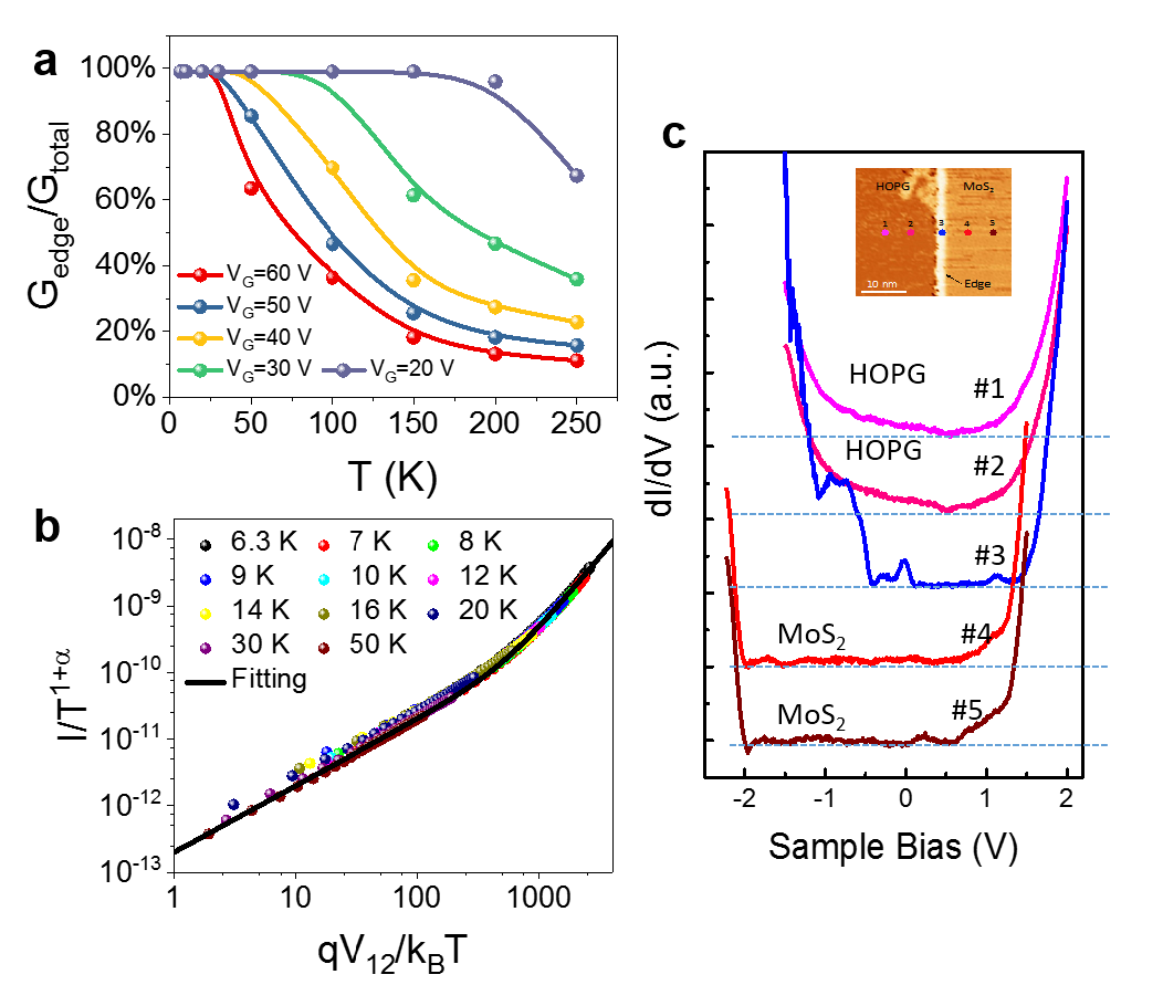 圖a.二維材料邊界電導(dǎo)比例與溫度、柵壓關(guān)系。圖b. I/T1+α與qV/kBT關(guān)系。圖c. STS能譜。