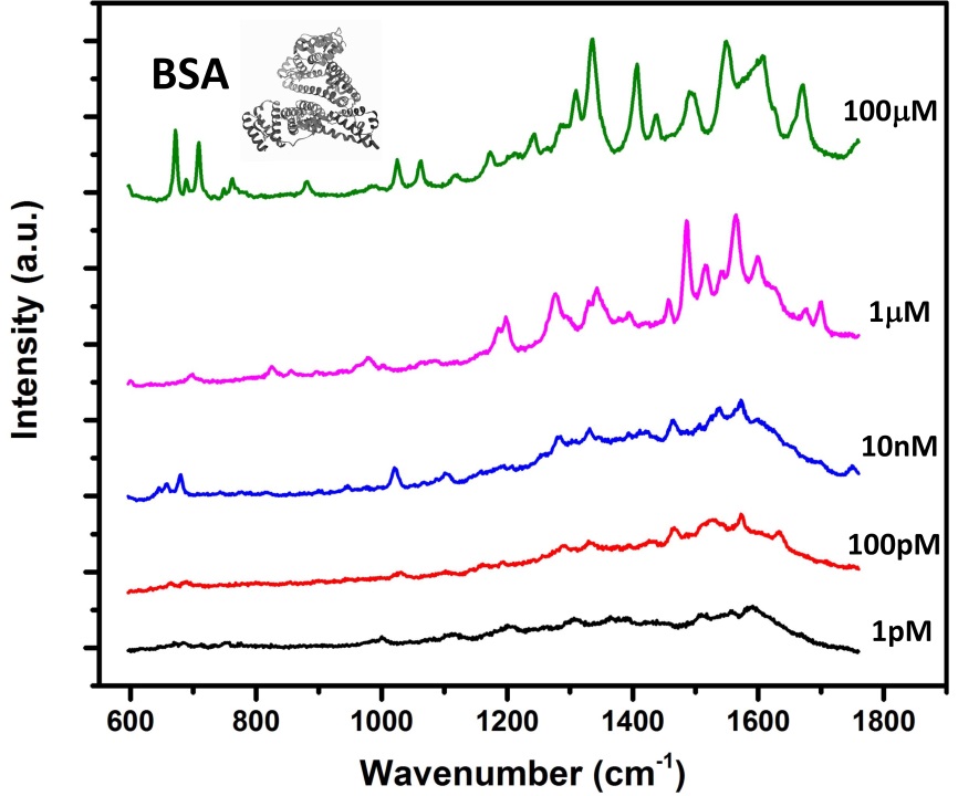 此類傳感器相比同類液相環(huán)境下檢測的傳感器,表現(xiàn)出更高的檢測能力,能夠?qū)崿F(xiàn)對羅丹明6G的低極限檢測(100 fM),對液體活檢分析中常用的功能性探針分子(對氨基硫酚與2-巰基吡啶)具備較強(qiáng)的檢測特異性。通過檢測牛血清白蛋白(BSA),該傳感器的生物檢測能力也被驗(yàn)證,BSA的檢測限低至1 pM。上述工作表明該傳感器對生物分子檢測有極大的應(yīng)用前景。