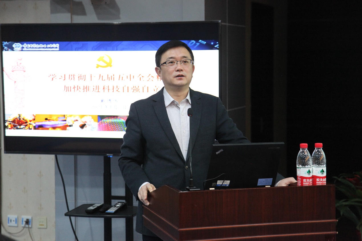 戴博偉在報告中簡要介紹了全會的基本情況、重要成果、重大意義和規(guī)劃《建議》的概況,介紹了“十四五”時期我國發(fā)展必須遵循的五個重要原則,重點(diǎn)解讀了規(guī)劃《建議》中關(guān)于科技創(chuàng)新的內(nèi)容,指出,堅(jiān)持創(chuàng)新在現(xiàn)代化建設(shè)全局中的核心地位,把科技自立自強(qiáng)作為國家發(fā)展戰(zhàn)略支撐、擺在各項(xiàng)規(guī)劃任務(wù)的首位進(jìn)行專章部署,這是我們黨編制五年規(guī)劃建議歷史上的第一次,也是以習(xí)近平同志為核心的黨中央把握世界發(fā)展大勢、立足當(dāng)前、著眼長遠(yuǎn)作出的戰(zhàn)略布局。他從“強(qiáng)化國家戰(zhàn)略科技力量”等六個方面,對規(guī)劃《建議》關(guān)于科技創(chuàng)新的新提法進(jìn)行了逐一闡釋,深入解讀了規(guī)劃《建議》關(guān)于科技創(chuàng)新的新部署、新要求,結(jié)合微電子所2020年冬季戰(zhàn)略研討會精神,通報了研究所落實(shí)中央精神和院黨組決策部署,做好“十四五”時期“一三五”規(guī)劃的工作思路、工作步驟和下一步工作重點(diǎn)。他要求,全所各級黨組織要開展各類宣教活動,組織深入學(xué)習(xí)黨的十九屆五中全會精神;黨員領(lǐng)導(dǎo)干部要發(fā)揮好表率作用,先學(xué)一步、學(xué)深一些,切實(shí)把學(xué)習(xí)成果轉(zhuǎn)化為推動工作的實(shí)際能力。他號召全所黨員群眾進(jìn)一步統(tǒng)一思想、形成共識、匯聚力量,在所黨政領(lǐng)導(dǎo)班子的帶領(lǐng)下,全力做好“十四五”開局工作,推動研究所發(fā)展再上一個新臺階,以優(yōu)異成績迎接建黨一百周年。