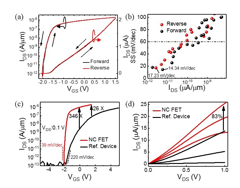 圖(a) MoS2 NCFET轉移曲線。(b)亞閾值擺幅~溝道電流關系。MoS2 NCFET與MoS2 FET對比數(shù)據(jù):(c)轉移曲線和(d)輸出曲線