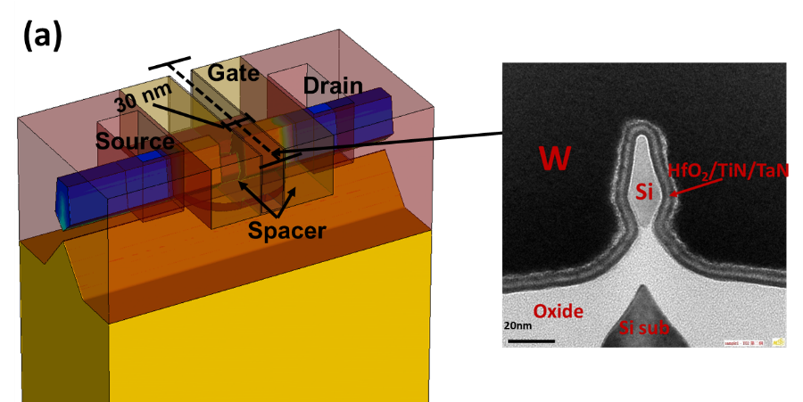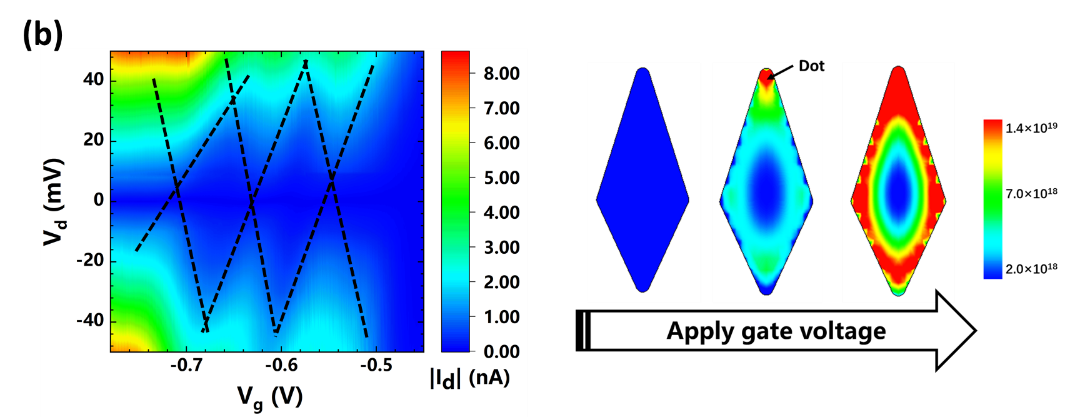 (a)器件結(jié)構(gòu)示意圖及溝道截面TEM分析;(b)庫(kù)倫菱形穩(wěn)定圖及部分仿真分析