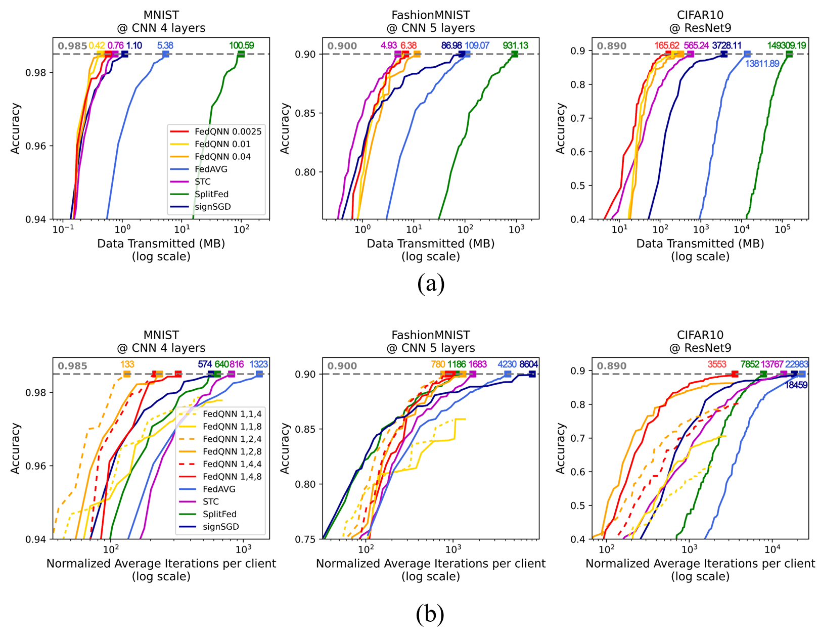 近日,微電子所陳嵐研究員團(tuán)隊(duì)提出了一種面向物聯(lián)網(wǎng)應(yīng)用的計(jì)算、通信高效的聯(lián)邦學(xué)習(xí)框架“FedQNN”(圖1),首次將超低位寬量化技術(shù)集成到聯(lián)邦學(xué)習(xí)中,允許客戶端以輕量化的定點(diǎn)格式執(zhí)行絕大部分計(jì)算負(fù)載,極大地降低了計(jì)算功耗(圖2,a)。在通信方面,本框架利用稀疏和量化策略對(duì)上行和下行數(shù)據(jù)進(jìn)行壓縮。在對(duì)多個(gè)數(shù)據(jù)集和模型的實(shí)驗(yàn)結(jié)果表明,本框架能在不明顯影響模型精度的前提下,降低90% 的終端計(jì)算能耗、將模型尺寸壓縮30倍以上,極大地減小了通信帶寬需求和傳輸數(shù)據(jù)量(圖2,b),顯著降低了聯(lián)邦學(xué)習(xí)的部署成本,提高了其在IoT系統(tǒng)中的實(shí)用性,為解決智能晶圓制造EDA工具領(lǐng)域的數(shù)據(jù)隱私保護(hù)問(wèn)題提供了新方法。