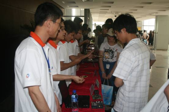 作品展示臺(tái)前,參觀者通過觀看影像以及與選手的直接交流或親自動(dòng)手操作,對(duì)作品所表達(dá)的科學(xué)道理有了更加深入和形象的理解,對(duì)微電子技術(shù)產(chǎn)生了濃厚的興趣。最后,每位參觀者還親自投票選出了最喜歡的作品。通過評(píng)比,七室周雋雄、連永懿的作品《感知地球——物聯(lián)的世界》獲得一等獎(jiǎng);四室戈勤的《它——讓大象進(jìn)冰箱》,九室相海飛、周靜的《激光通信——超級(jí)計(jì)算機(jī)、高清視頻、高速網(wǎng)絡(luò)的幕后英雄》獲得二等獎(jiǎng);六室劉暢的《神奇的小型化通信世界》,十一室黃水龍的《神奇的射頻標(biāo)簽(RFID)技術(shù)》獲得三等獎(jiǎng)。