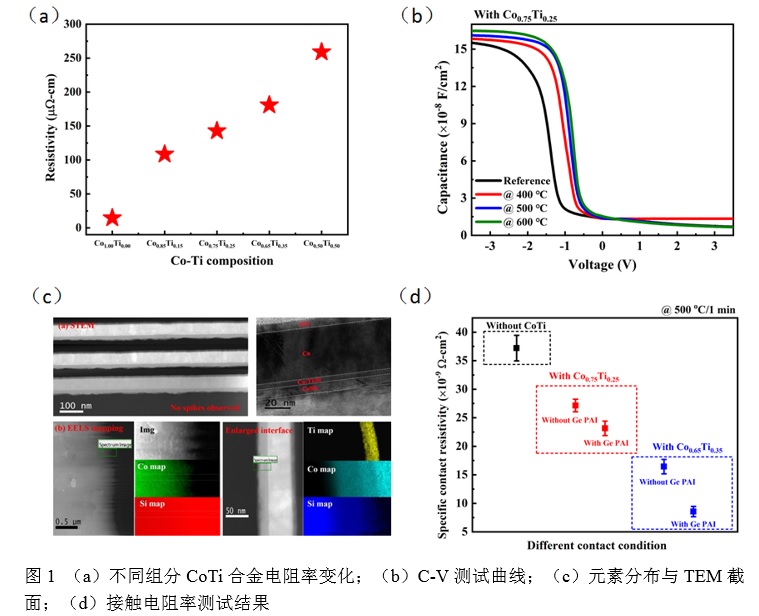針對(duì)先進(jìn)Co互連,課題組采用Co、Ti靶材共濺射方法制備了非晶CoTi合金,并對(duì)其能否取代傳統(tǒng)Ti/TiN或者Ta/TaN雙層襯墊層/阻擋層進(jìn)行了系統(tǒng)研究。首先制備了不同組分的CoTi合金,優(yōu)化出了電阻率適中,熱穩(wěn)定性、粘附性、粗糙度等性能良好的合金組分做進(jìn)一步研究。然后通過施加電應(yīng)力、熱應(yīng)力測(cè)試電容-電壓(C-V)曲線,分析離子擴(kuò)散情況,發(fā)現(xiàn)CoTi合金可有效阻擋互連線中Co離子向SiO2中擴(kuò)散。同時(shí),在局部接觸孔互連中,課題組分析了CoTi合金的阻擋特性,發(fā)現(xiàn)CoTi合金不僅有效阻止了Co與襯底Si的互擴(kuò)散,延緩高阻態(tài)CoSi的生成,還改善了接觸的界面形貌,有利于降低接觸電阻率。課題組結(jié)合Ge預(yù)非晶化(Ge PAI)工藝,在n+-Si襯底上,以Co作為局部接觸金屬,非晶CoTi合金作為單層襯墊層/阻擋層,獲得了8.56×10-9 Ω-cm2的超低接觸電阻率。近期,上述成果以“Investigation of Barrier Property of Amorphous Co-Ti Layer as Single Barrier/Liner in Local Co Interconnects”(DOI: 10.1109/TED.2020.2983302)為題發(fā)表在IEEE Transactions on Electron Devices期刊。
