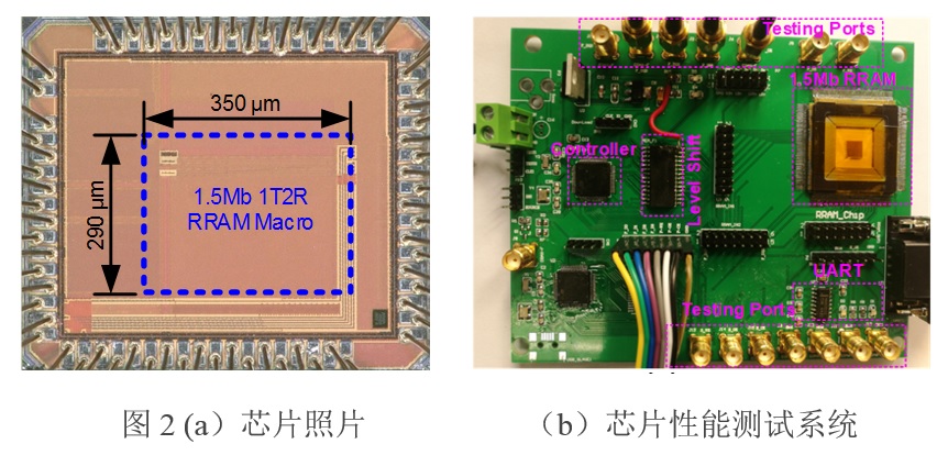 在新型存儲(chǔ)器方面,劉明院士/呂杭炳研究員團(tuán)隊(duì)與復(fù)旦大學(xué)薛曉勇副教授合作首次提出了基于PMOS選擇器的1T2R 結(jié)構(gòu)RRAM單元,并采用分層位線和三態(tài)單元存儲(chǔ)技術(shù),使漏電流降低了90%以上。設(shè)計(jì)了電流精確補(bǔ)償限流電路和自適應(yīng)寫驅(qū)動(dòng)電路,大幅度提高了陣列的可靠性,同時(shí)開發(fā)了基于1T2R 自身陣列特點(diǎn)的高速電流型讀取電路,實(shí)現(xiàn)了極端條件下的高速讀取。論文展示了28nm的1.5Mb RRAM測(cè)試芯片,將嵌入式NVM 存儲(chǔ)密度記錄提高了40%,達(dá)到14.8 Mb / mm2(圖2)。