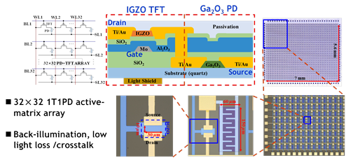 基于該成果的文章“First Demonstration of High-Sensitivity (NEP<1fW·Hz-1/2) Back-Illuminated Active-Matrix Deep UV Image Sensor by Monolithic Integration of Ga2O3 Photodetectors and Oxide Thin-Film-Transistors”入選2022 VLSI。微電子所覃愿博士為第一作者,陸叢研助理研究員和余兆安高級(jí)工程師為共同一作,中科大龍世兵教授和微電子所李泠研究員為通訊作者。