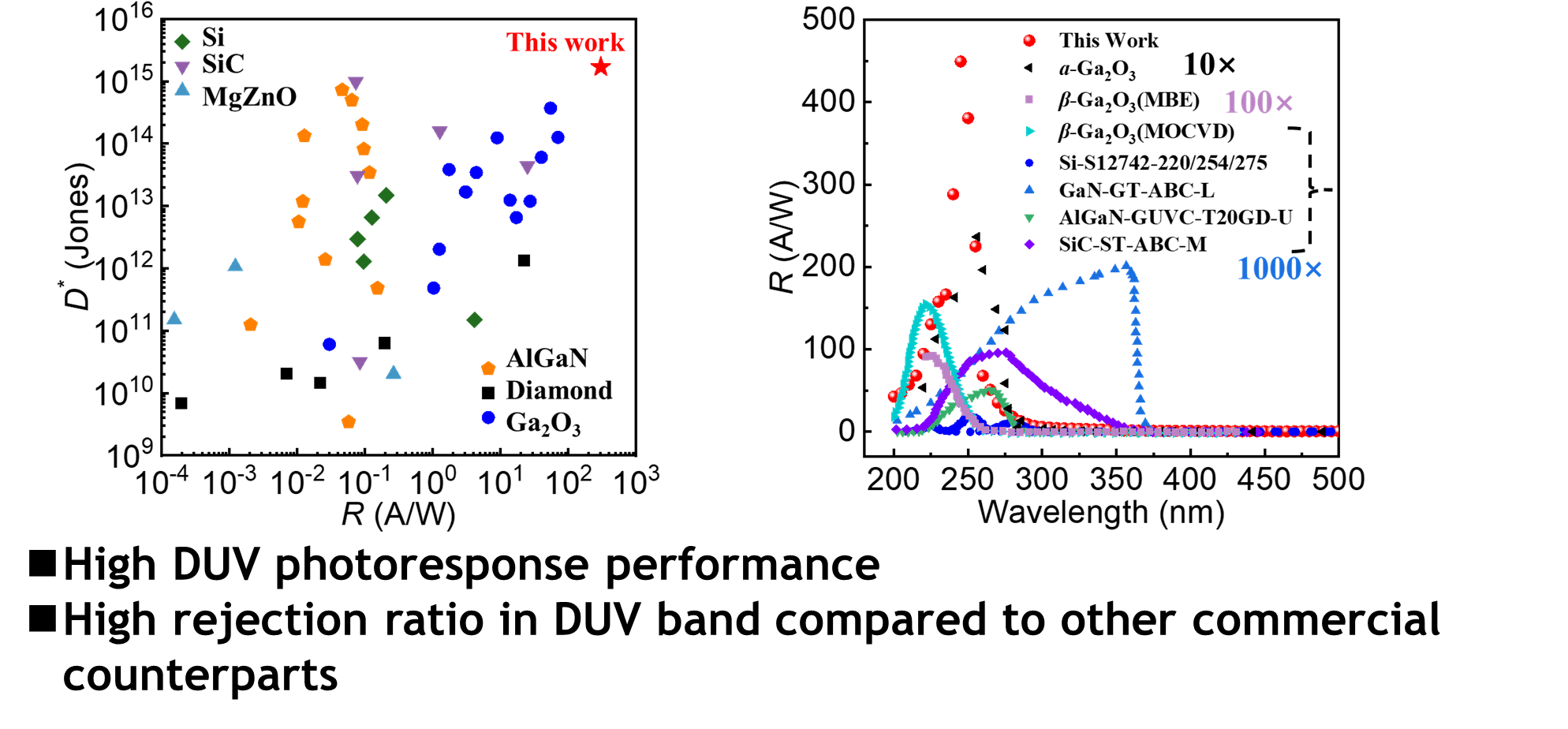 圖2. 該工作與其他已報(bào)道的深紫外探測(cè)器性能對(duì)比