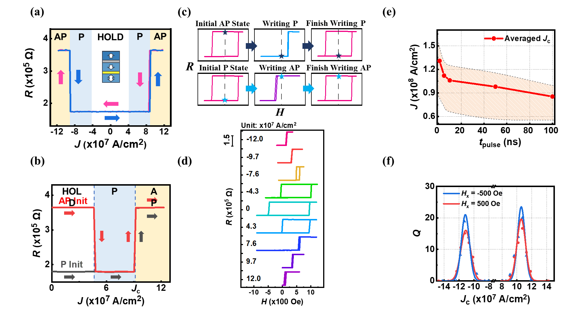 圖2. (a)SOT-MTJ電學(xué)寫入特性曲線。(b)SOT-MTJ存儲(chǔ)狀態(tài)與寫入電流密度大小的關(guān)系。(c)不同寫入操作的磁學(xué)特性原理示意。(d)矯頑場(chǎng)和偏置場(chǎng)隨寫入電流密度的變化關(guān)系。(e)臨界寫入電流密度與寫入脈沖寬度的關(guān)系。(f)隨機(jī)采樣器件的臨界寫入電流密度統(tǒng)計(jì)分布。
